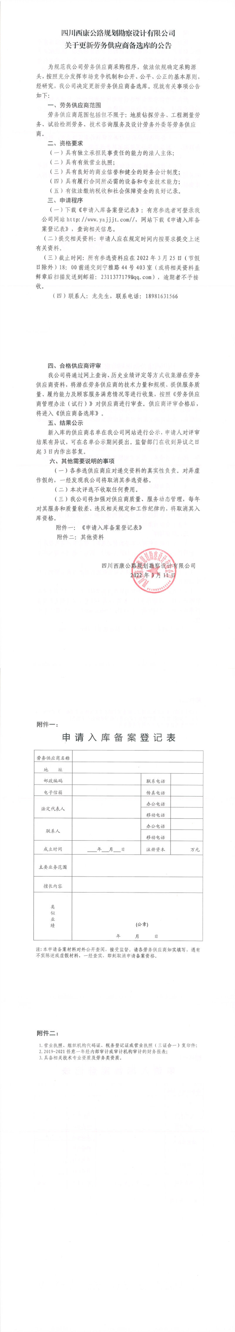 四川西康公路規(guī)劃勘察設計有限公司關(guān)于更新勞務供應商備選庫的公告
