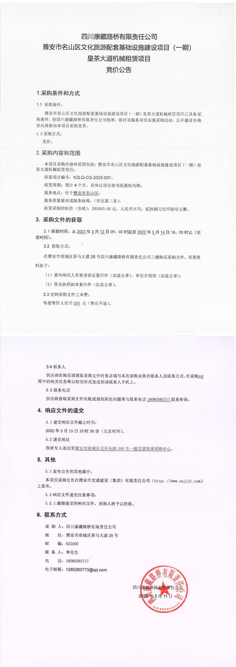 四川康藏路橋有限責(zé)任公司雅安市名山區(qū)文化旅游配套基礎(chǔ)設(shè)施建設(shè)項(xiàng)目(一期)皇茶大道機(jī)械租賃項(xiàng)目競價(jià)公告