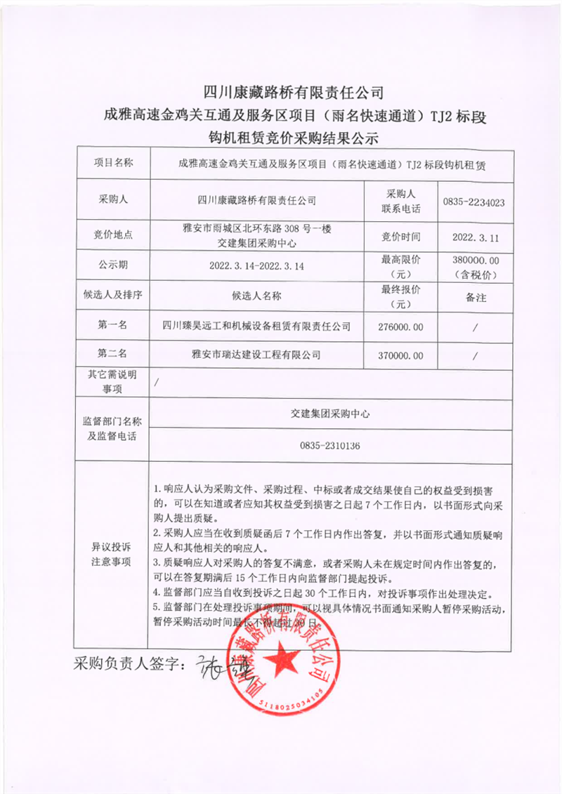 四川康藏路橋有限責(zé)任公司成雅高速金雞關(guān)互通及服務(wù)區(qū)項(xiàng)目(雨名快速通道)TJ2標(biāo)段鉤機(jī)租賃競(jìng)價(jià)采購(gòu)結(jié)果公示