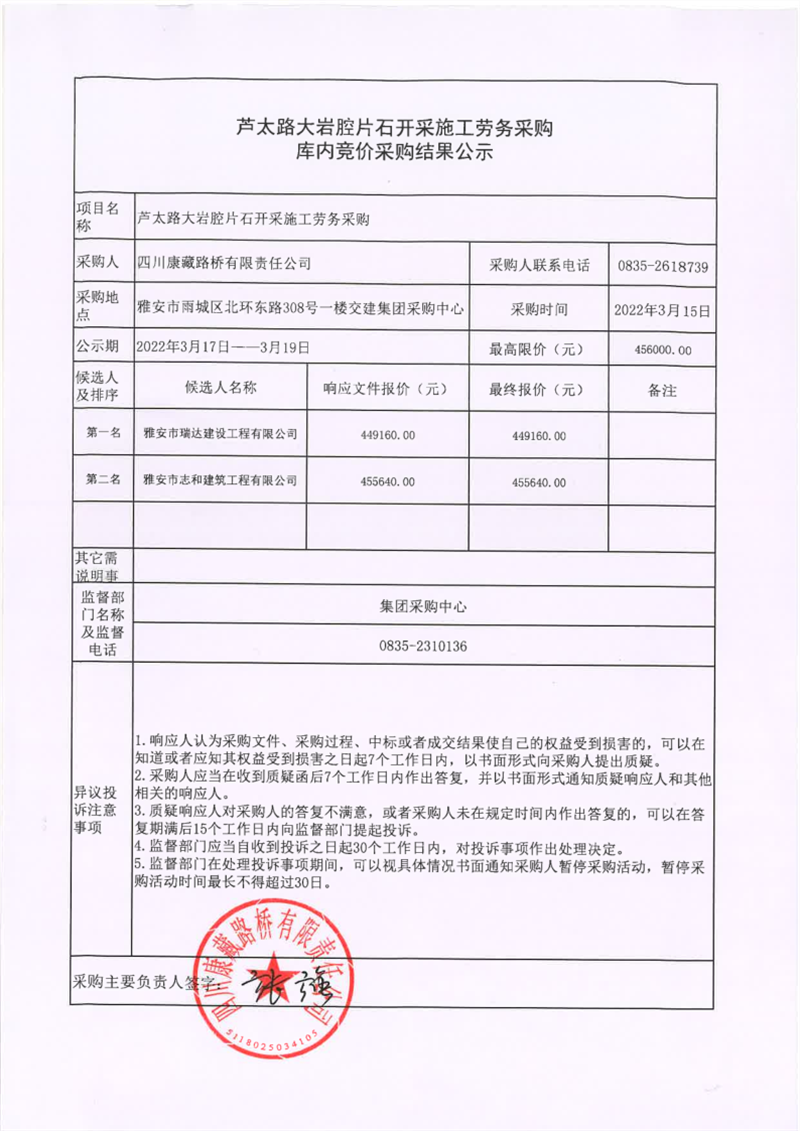 四川康藏路橋有限責任公司蘆太路大巖腔片石開采施工勞務采購庫內競價采購結果公示
