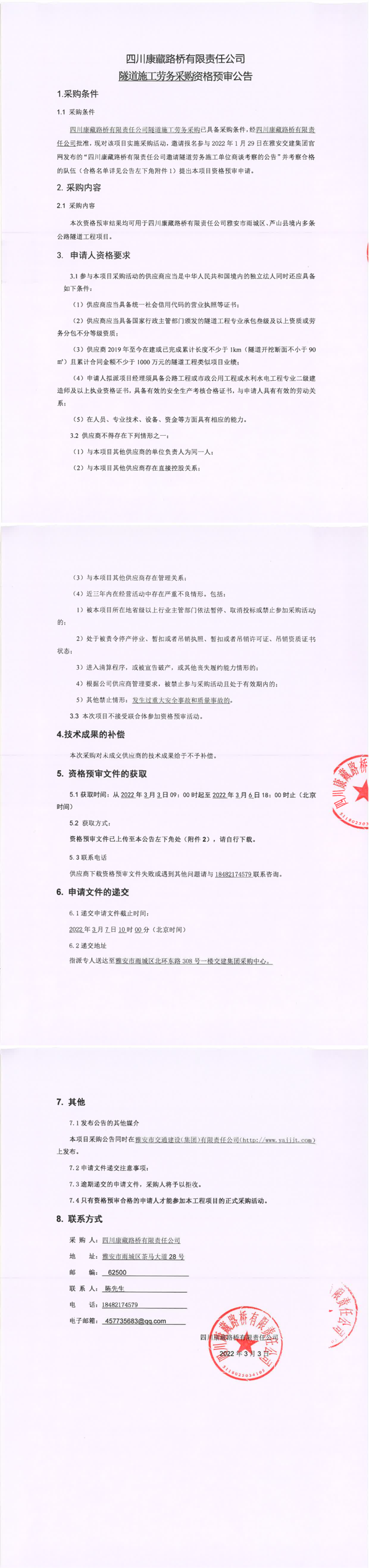 四川康藏路橋有限責(zé)任公司隧道施工勞務(wù)采購(gòu)資格預(yù)審公告