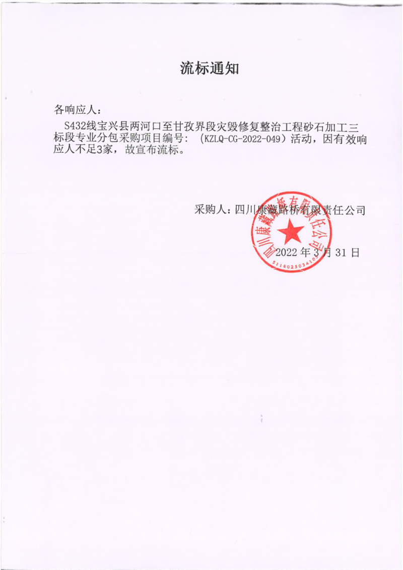 四川康藏路橋有限責任公司S432線寶興縣兩河口至甘孜界段災(zāi)毀修復(fù)整治工程砂石加工三標段專業(yè)分包采購項目流標通知