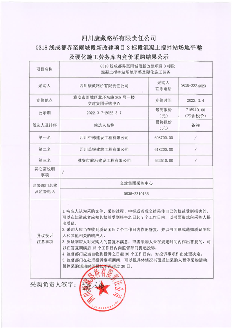 四川康藏路橋有限責任公司G318線成都界至雨城段新改建項目3標段混凝土攪拌站場地平整及硬化施工勞務庫內(nèi)競價采購結(jié)果公示