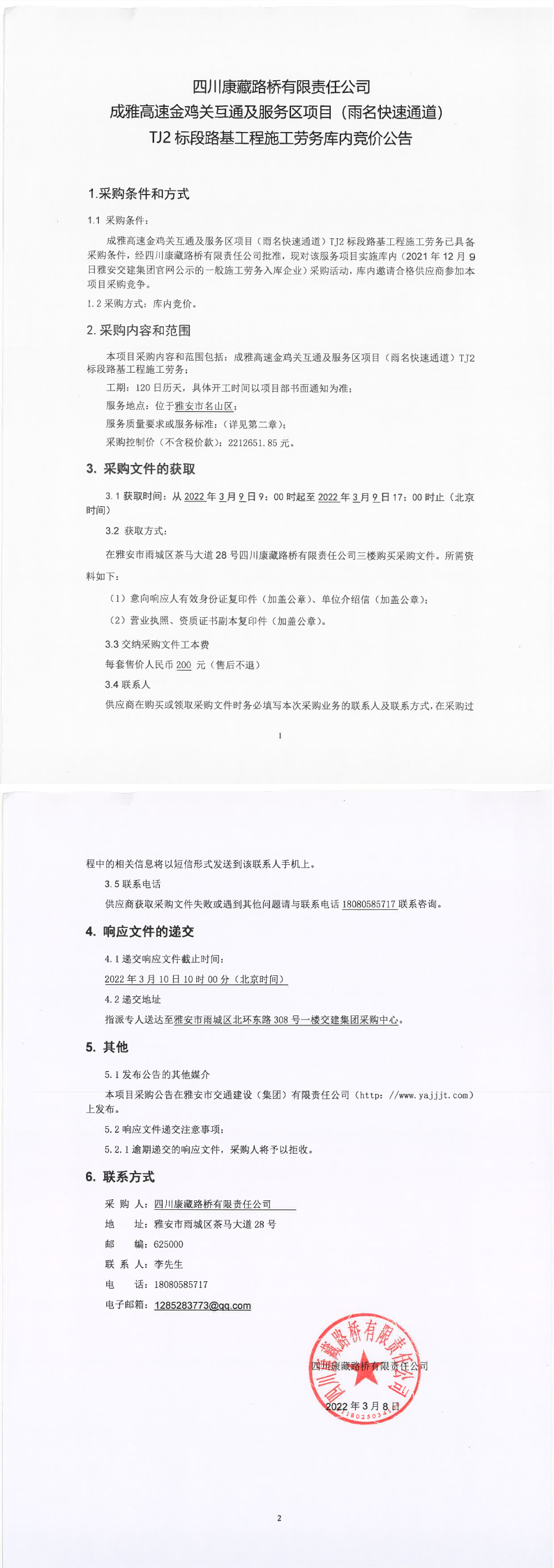 四川康藏路橋有限責(zé)任公司成雅高速金雞關(guān)互通及服務(wù)區(qū)項(xiàng)目(雨名快速通道)TJ2標(biāo)段路基工程施工勞務(wù)庫內(nèi)競(jìng)價(jià)公告