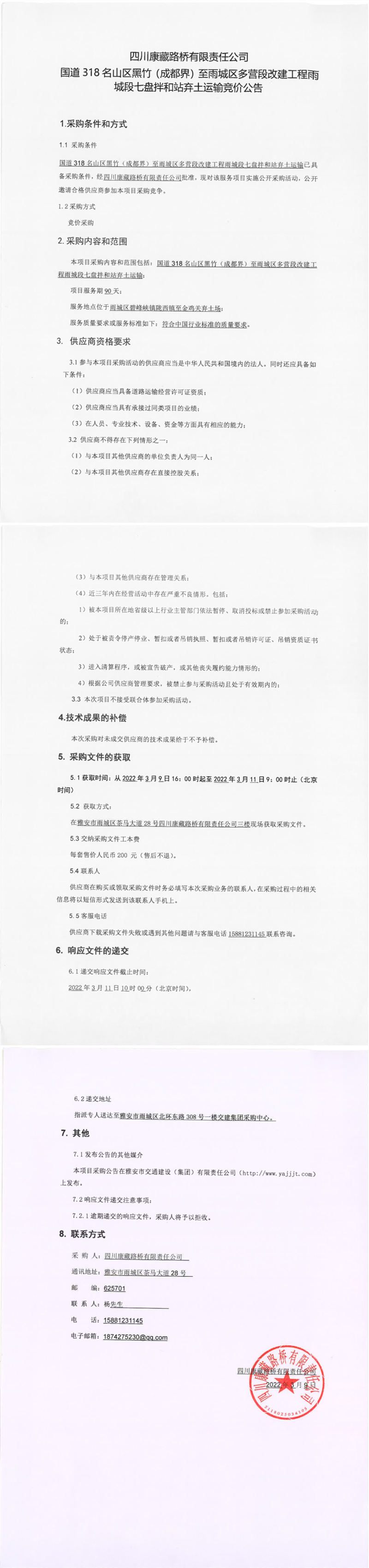四川康藏路橋有限責(zé)任公司國道318名山區(qū)黑竹(成都界)至雨城區(qū)多營段改建工程雨城段七盤拌和站棄土運(yùn)輸競價(jià)公告