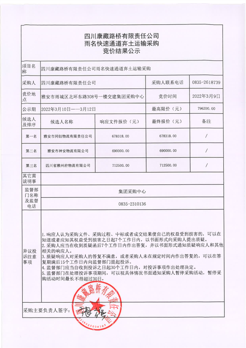 四川康藏路橋有限責(zé)任公司雨名快速通道棄土運(yùn)輸采購競價(jià)結(jié)果公示