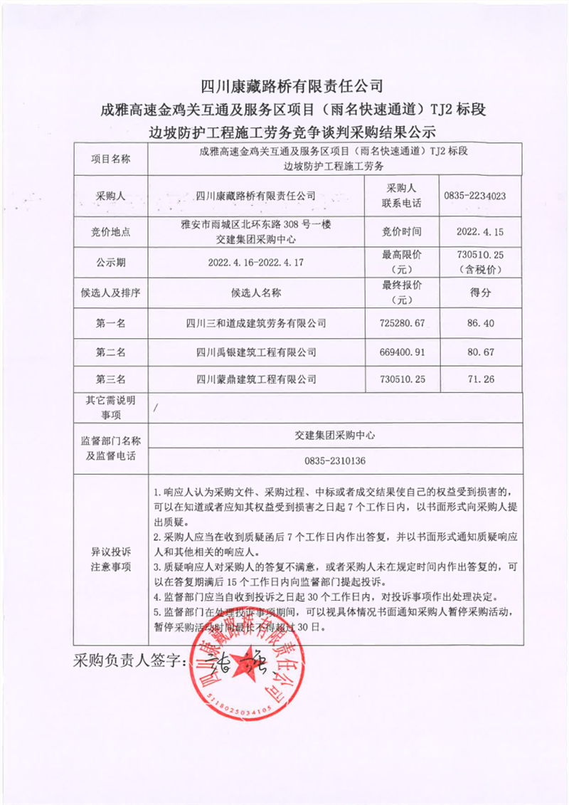 四川康藏路橋有限責任公司成雅高速金雞關(guān)互通及服務區(qū)項目(雨名快速通道)TJ2標段邊坡防護工程施工勞務競爭談判采購結(jié)果公示