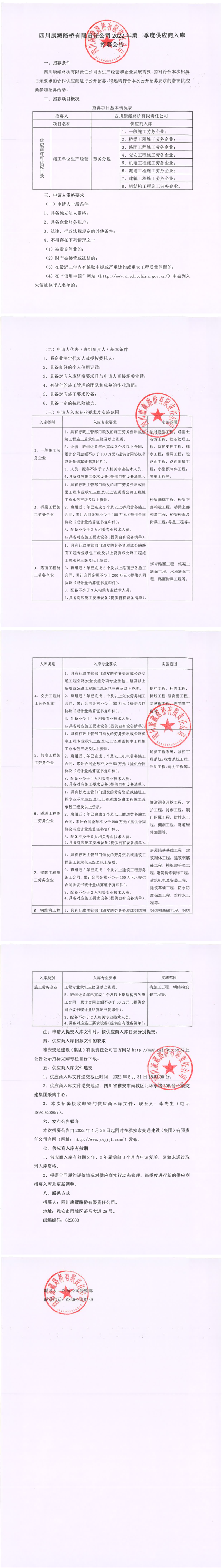 四川康藏路橋有限責任公司2022年第二季度供應商入庫招募公告