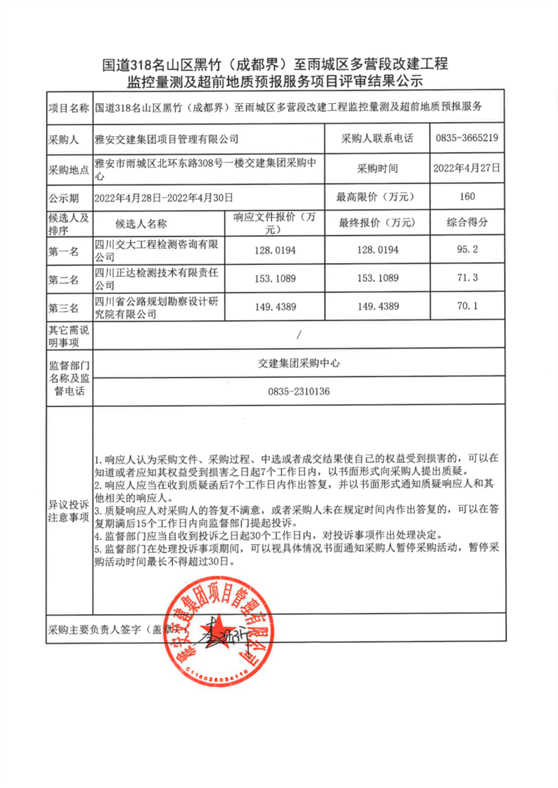 雅安交建集團(tuán)項目管理有限公司國道318名山區(qū)黑竹(成都界)至雨城區(qū)多營段改建工程監(jiān)控量測及超前地質(zhì)預(yù)報服務(wù)項目評審結(jié)果公示
