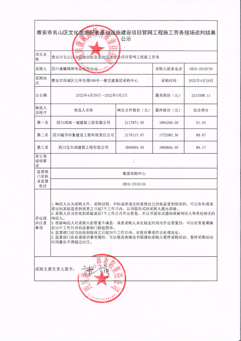 四川康藏路橋有限責(zé)任公司雅安市名山區(qū)文化旅游配套基礎(chǔ)設(shè)施建設(shè)項(xiàng)目管網(wǎng)工程施工勞務(wù)現(xiàn)場(chǎng)談判結(jié)果公示