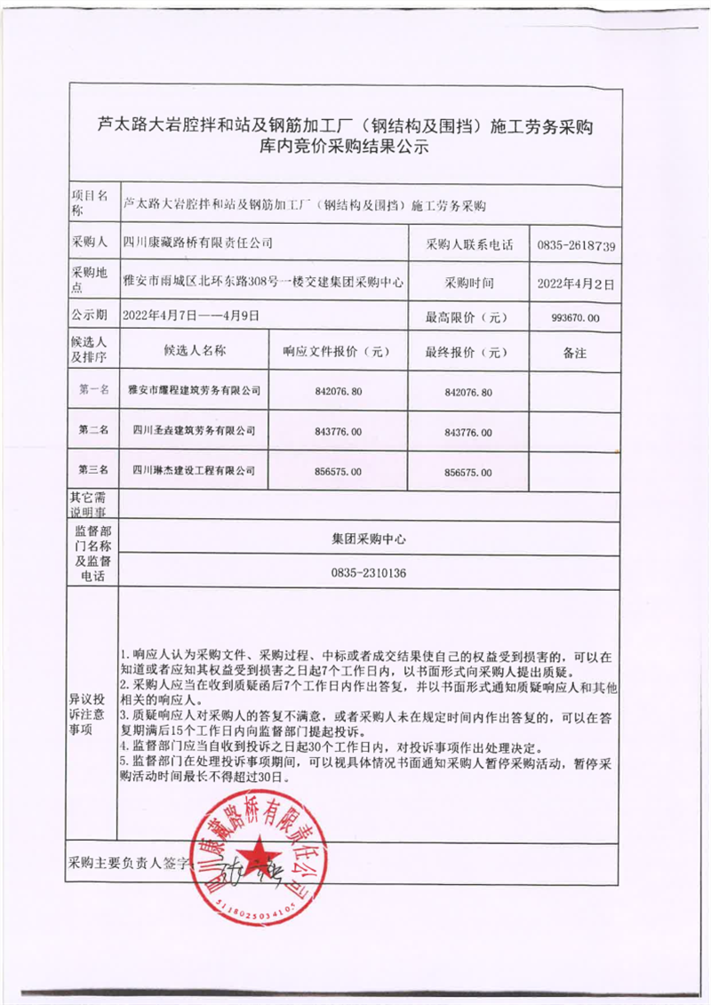 四川康藏路橋有限責任公司蘆太路大巖腔拌和站及鋼筋加工廠(鋼結(jié)構(gòu)及圍檔)施工勞務(wù)采購庫內(nèi)競價采購結(jié)果公示