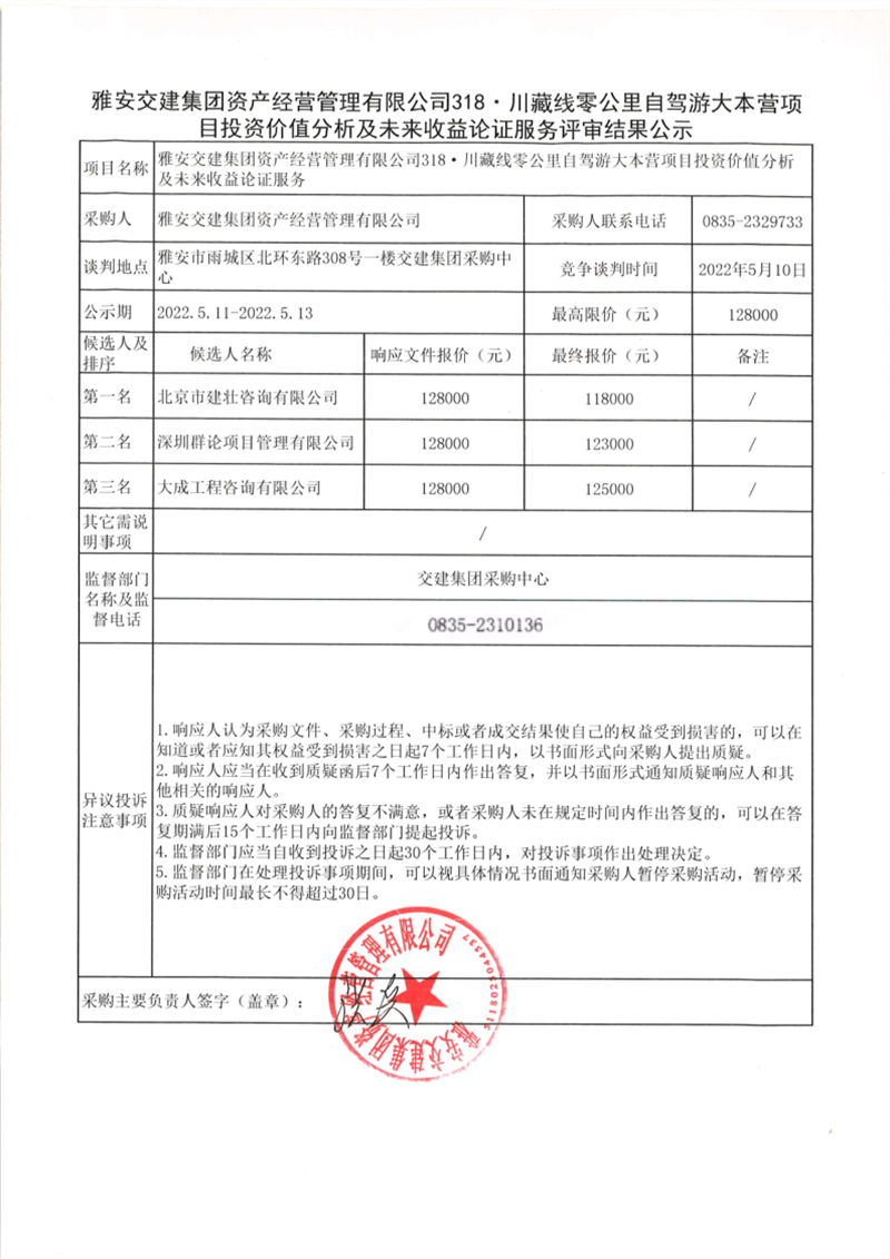 雅安交建集團(tuán)資產(chǎn)經(jīng)營管理有限公司318·川藏線零公里自駕游大本營項(xiàng)目投資價(jià)值分析及未來收益論證服務(wù)評(píng)審結(jié)果公示