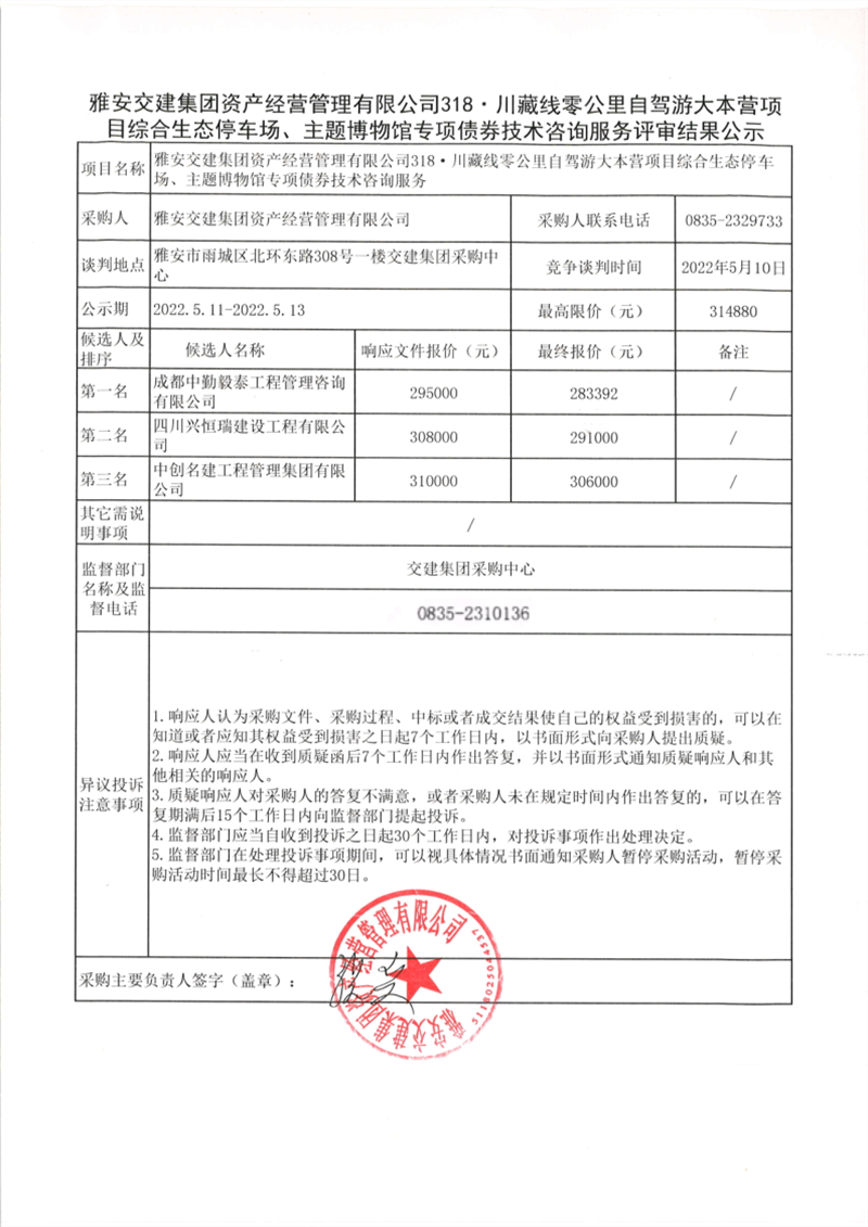 雅安交建集團資產經營管理有限公司318·川藏線零公里自駕游大本營項目綜合生態(tài)停車場、主題博物館專項債券技術咨詢服務評審結果公示