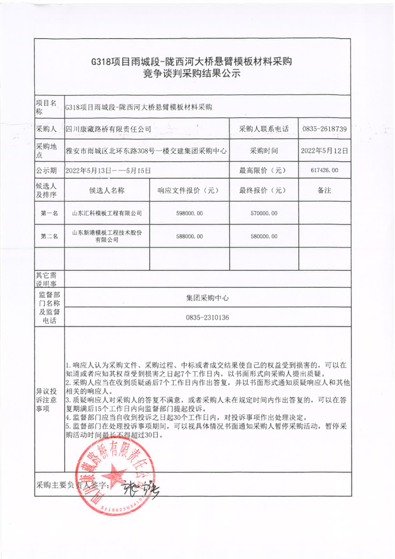 四川康藏路橋有限責(zé)任公司G318項(xiàng)目雨城段-隴西河大橋懸臂模板材料采購(gòu)競(jìng)爭(zhēng)談判采購(gòu)結(jié)果公示