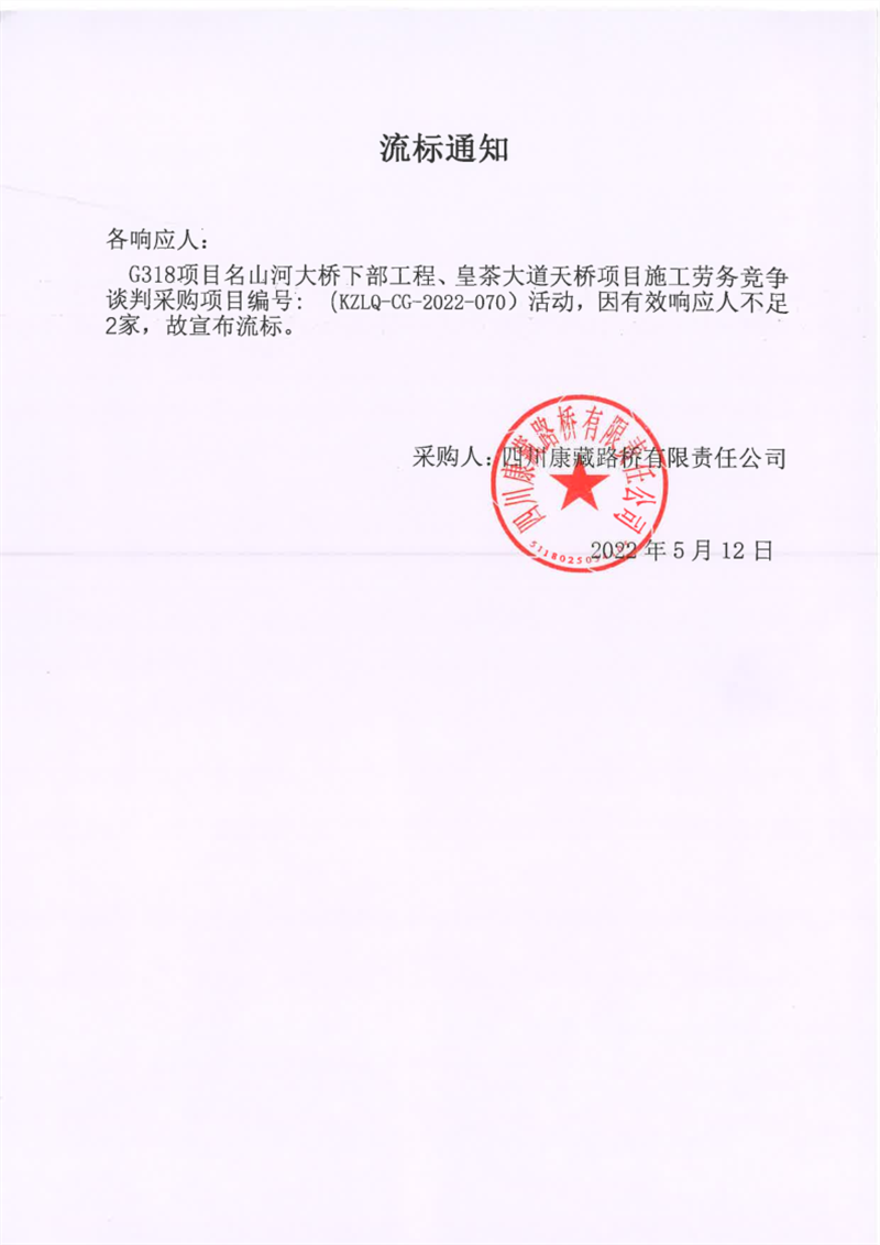 四川康藏路橋有限責任公司G318項目名山河大橋下部工程、皇茶大道天橋項目施工勞務談判采購項目流標通知