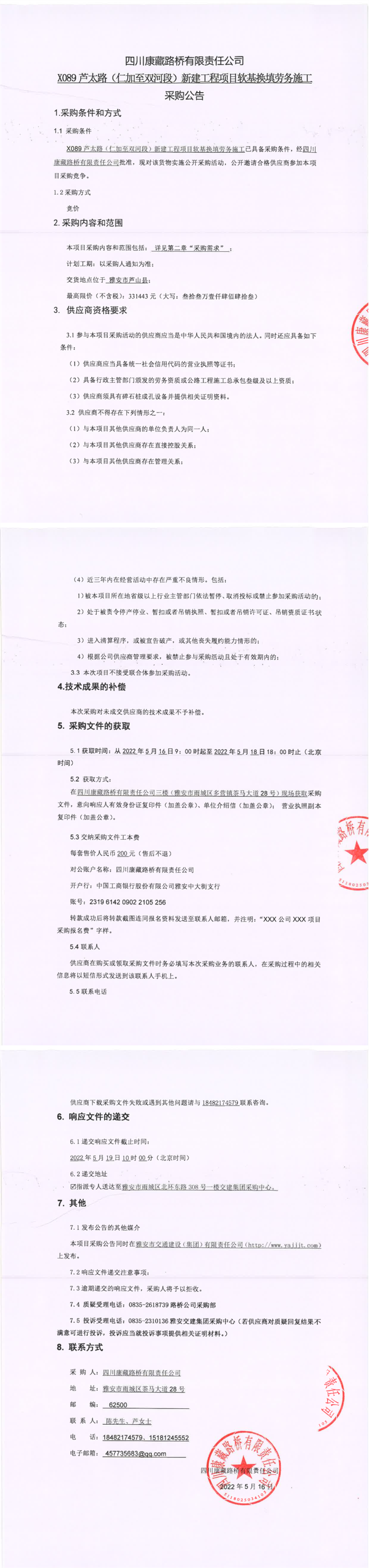四川康藏路橋有限責(zé)任公司X089蘆太路(仁加至雙河段)新建工程項目軟基換填勞務(wù)施工采購公告