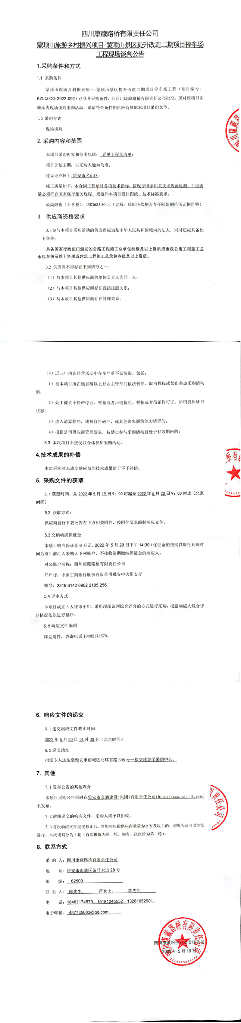 四川康藏路橋有限責(zé)任公司蒙頂山旅游鄉(xiāng)村振興項(xiàng)目-蒙頂山景區(qū)提升改造二期項(xiàng)目停車場(chǎng)工程現(xiàn)場(chǎng)談判公告