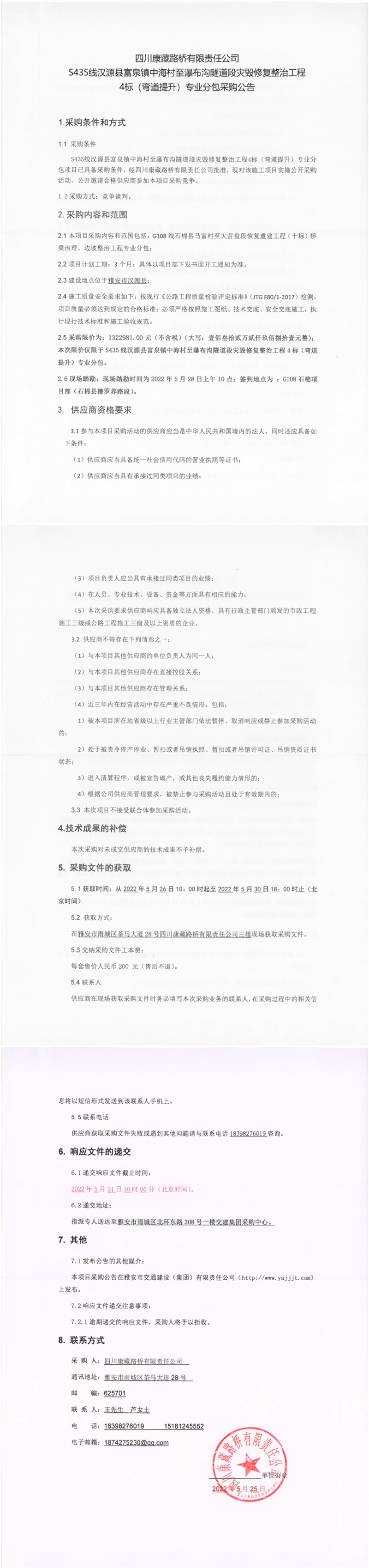四川康藏路橋有限責(zé)任公司S435線漢源縣富泉鎮(zhèn)中海村至瀑布溝隧道段災(zāi)毀修復(fù)整治工程4標(biāo)(彎道提升)專業(yè)分包采購公告