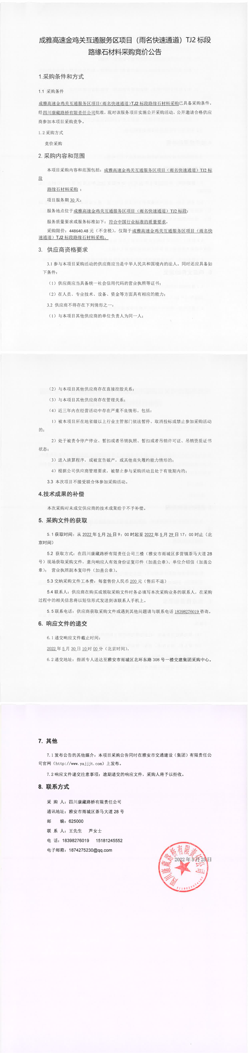 四川康藏路橋有限責任公司成雅高速金雞關互通服務區(qū)項目(雨名快速通道)TJ2標段路緣石材料采購競價公告
