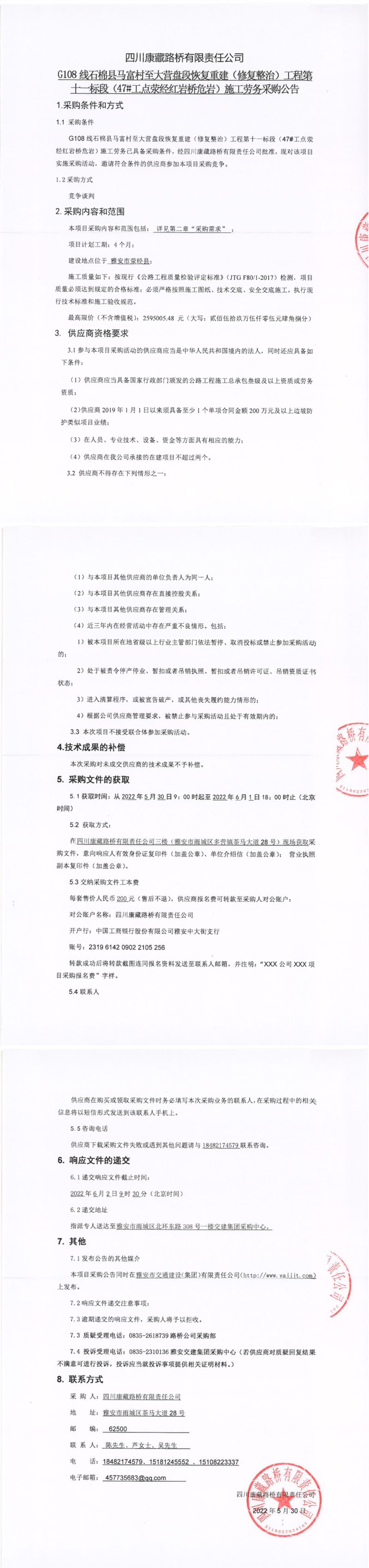 四川康藏路橋有限責(zé)任公司G108線石棉縣馬富村至大營(yíng)盤(pán)段恢復(fù)重建(修復(fù)整治)工程第十一標(biāo)段(47#工點(diǎn)滎經(jīng)紅巖橋危巖)施工勞務(wù)采購(gòu)公告
