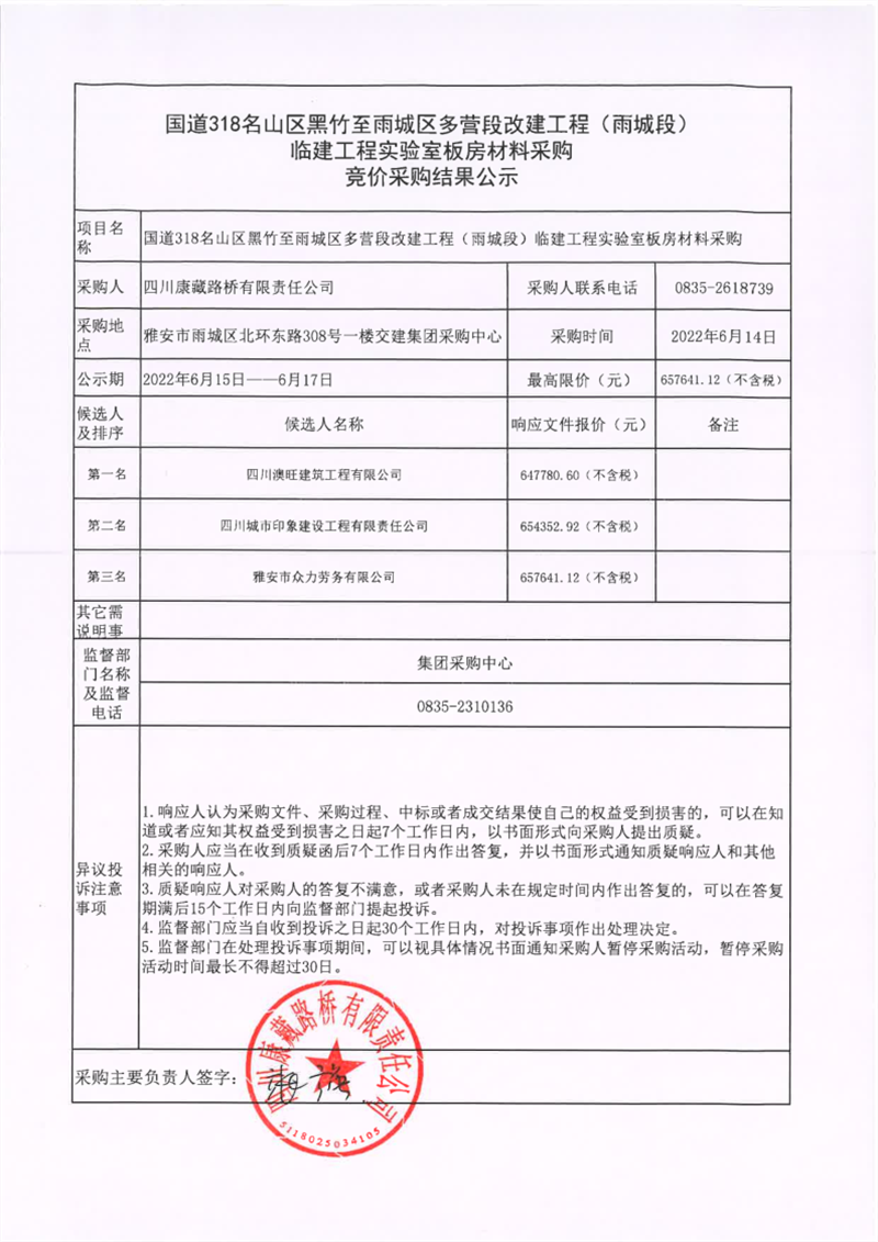 四川康藏路橋有限責(zé)任公司國道318名山區(qū)黑竹至雨城區(qū)多營段改建工程(雨城段)臨建工程實(shí)驗(yàn)室板房材料采購競(jìng)價(jià)采購結(jié)果公示