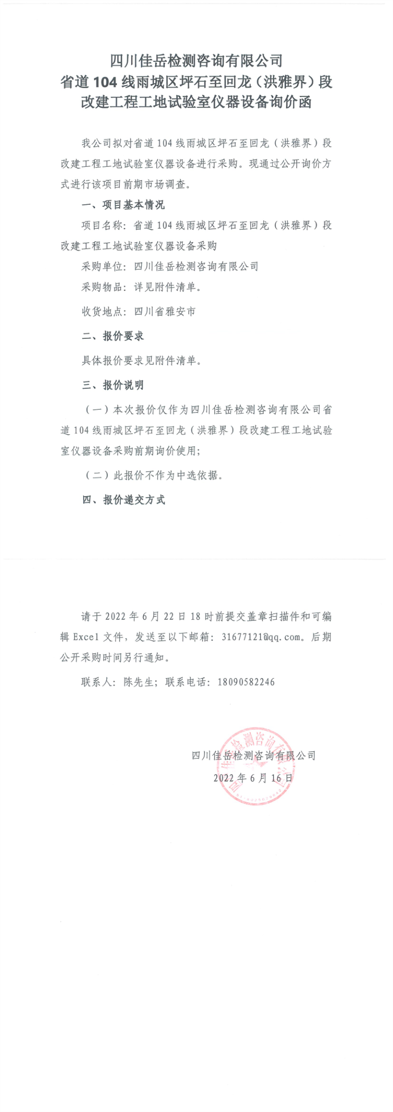 四川佳岳檢測咨詢有限公司省道104線雨城區(qū)坪石至回龍(洪雅界)段改建工程工地試驗室儀器設(shè)備詢價函