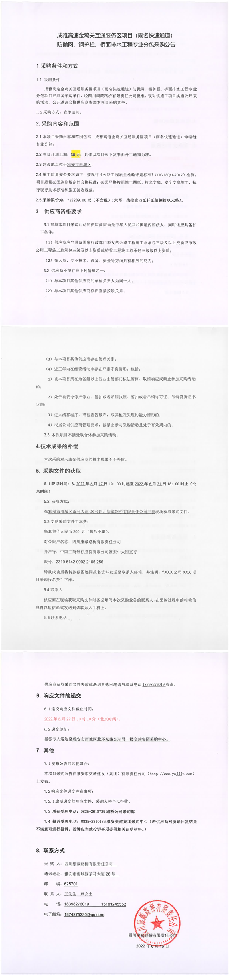 四川康藏路橋有限責(zé)任公司成雅高速金雞關(guān)互通服務(wù)區(qū)項(xiàng)目(雨名快速通道)防拋網(wǎng)、鋼護(hù)欄、橋面排水工程專業(yè)分包采購公告