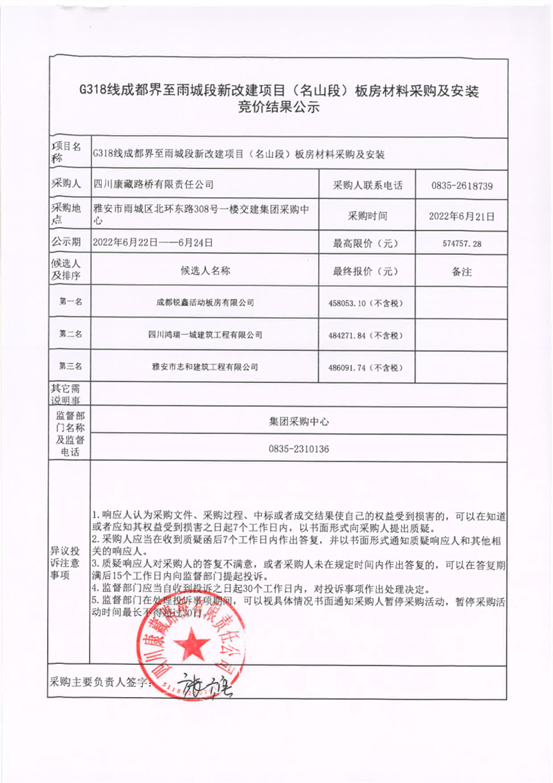 四川康藏路橋有限責(zé)任公司G318線(xiàn)成都界至雨城段新改建項(xiàng)目(名山段)板房材料采購(gòu)及安裝競(jìng)價(jià)結(jié)果公示