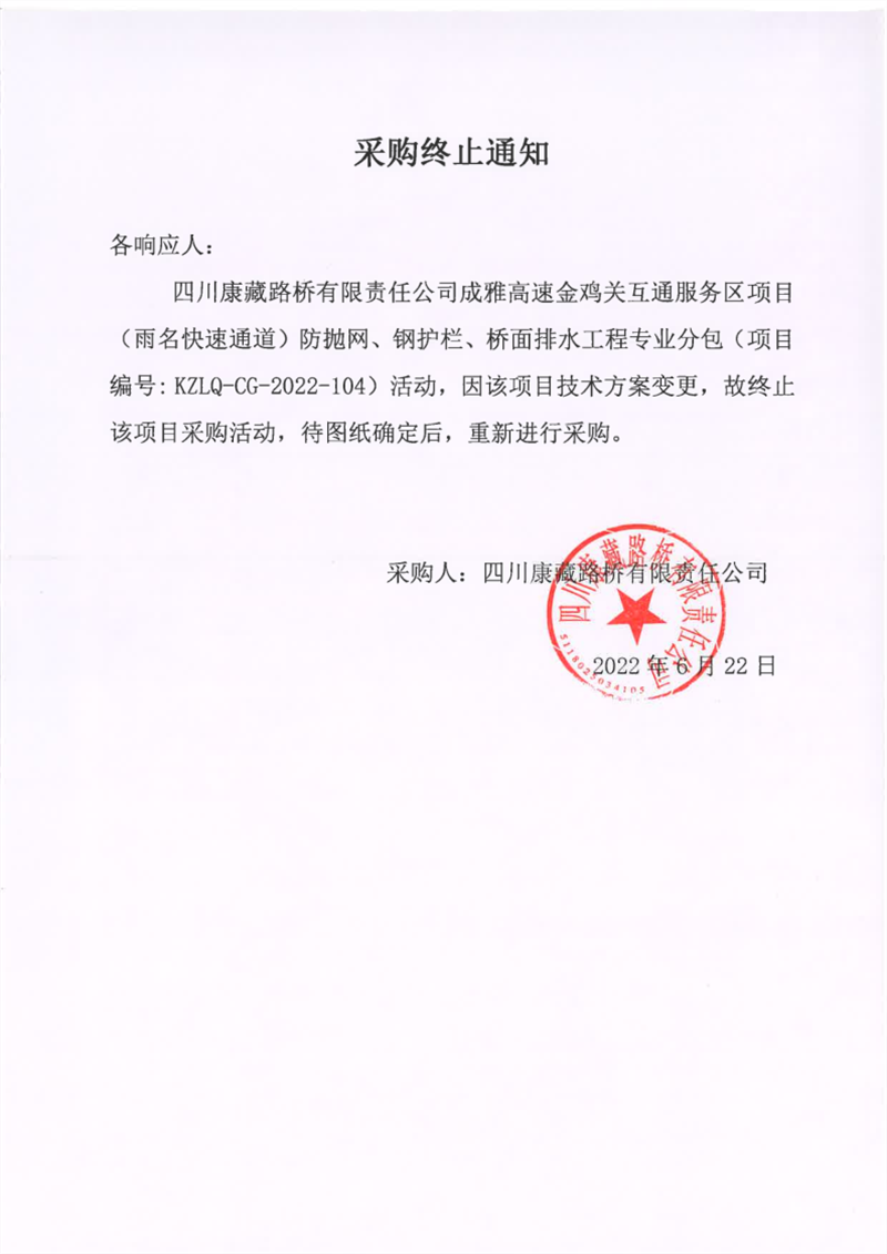四川康藏路橋有限責(zé)任公司成雅高速金雞關(guān)互通服務(wù)區(qū)項(xiàng)目(雨名快速通道)防拋網(wǎng)、鋼護(hù)欄、橋面排水工程專業(yè)分包采購(gòu)終止通知