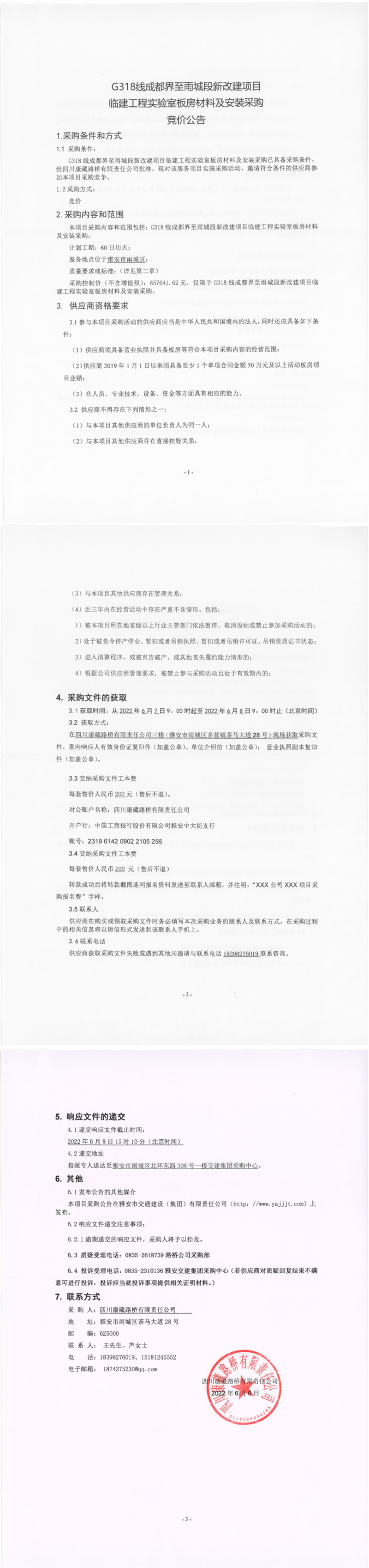四川康藏路橋有限責(zé)任公司G318線成都界至雨城段新改建項(xiàng)目臨建工程實(shí)驗(yàn)室板房材料及安裝采購競價(jià)公告