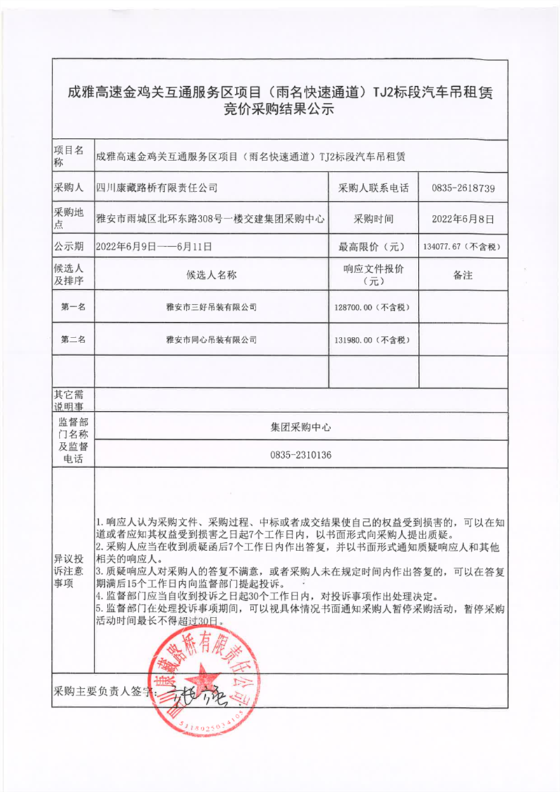 四川康藏路橋有限責任公司成雅高速金雞關(guān)互通服務(wù)區(qū)項目(雨名快速通道)TJ2標段汽車吊租賃競價采購結(jié)果公示