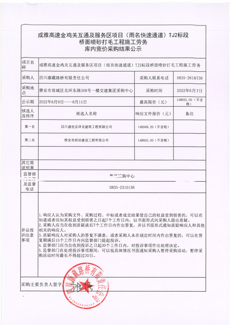四川康藏路橋有限責任公司成雅高速金雞關互通服務區(qū)項目(雨名快速通道)TJ2標段橋面噴砂打毛工程施工勞務庫內競價采購結果公示