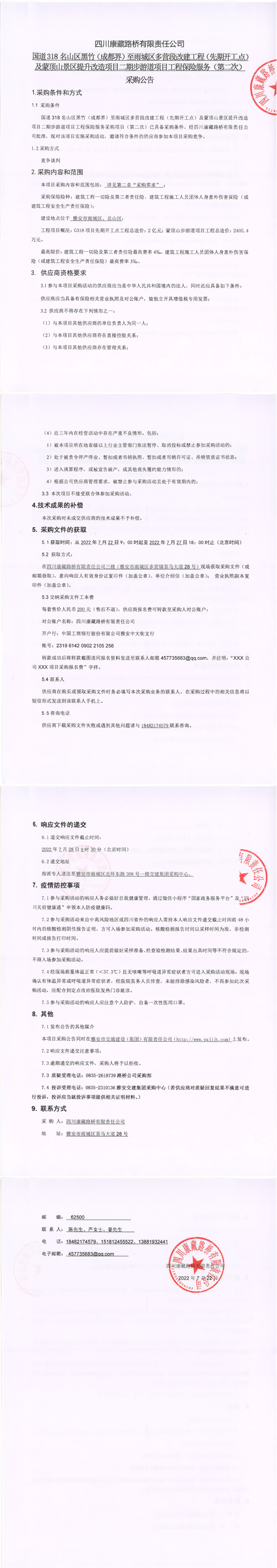 四川康藏路橋有限責任公司國道318名山區(qū)黑竹(成都界)至雨城區(qū)多營段改建工程(先期開工點)及蒙頂山景區(qū)提升改造項目二期步游道項目工程保險服務(第二次)采購公告