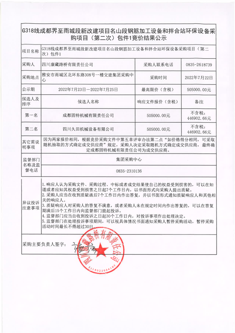 四川康藏路橋有限責(zé)任公司G318線成都界至雨城段新改建項目名山段鋼筋加工設(shè)備和拌合站環(huán)保設(shè)備采購項目(第二次)包件1競價結(jié)果公示