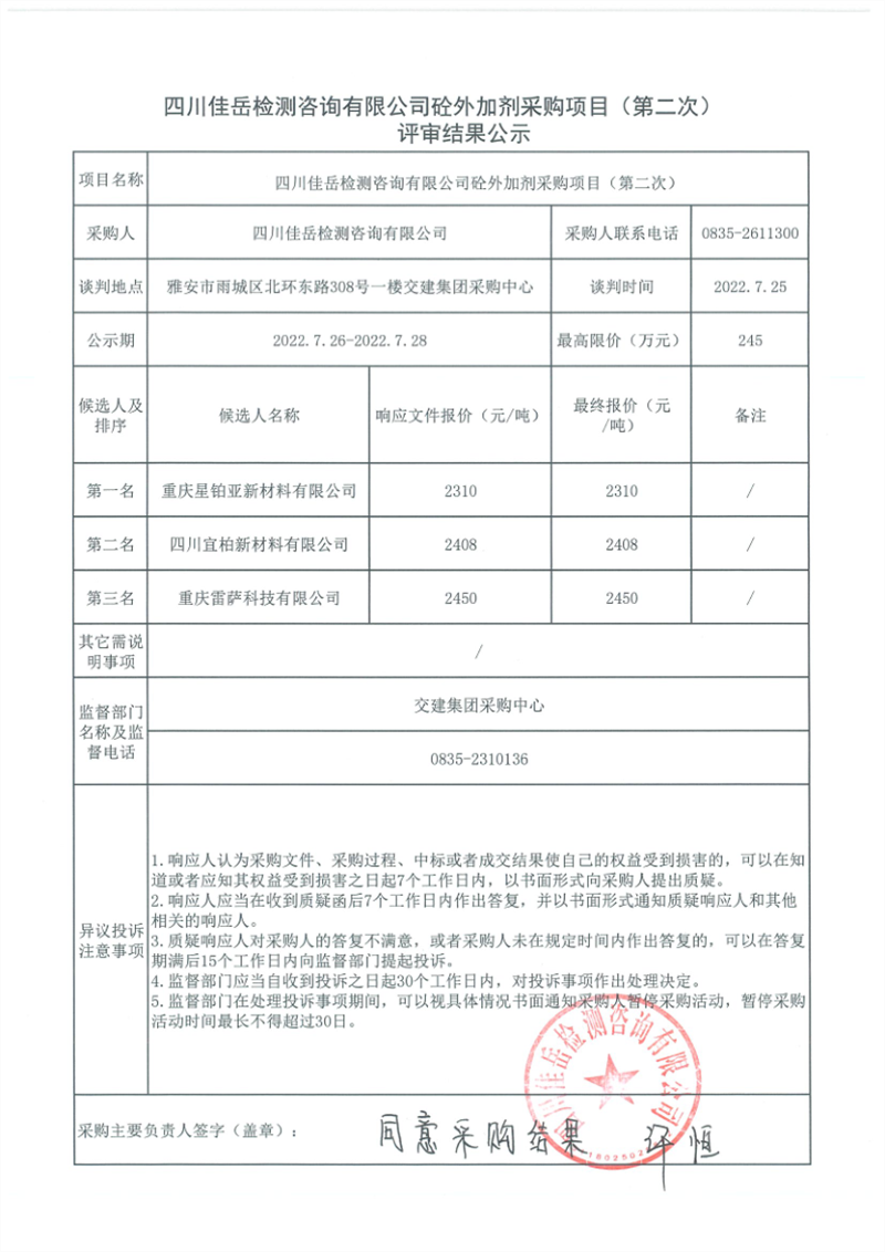 四川佳岳檢測咨詢有限公司砼外加劑采購項(xiàng)目(第二次)評審結(jié)果公示