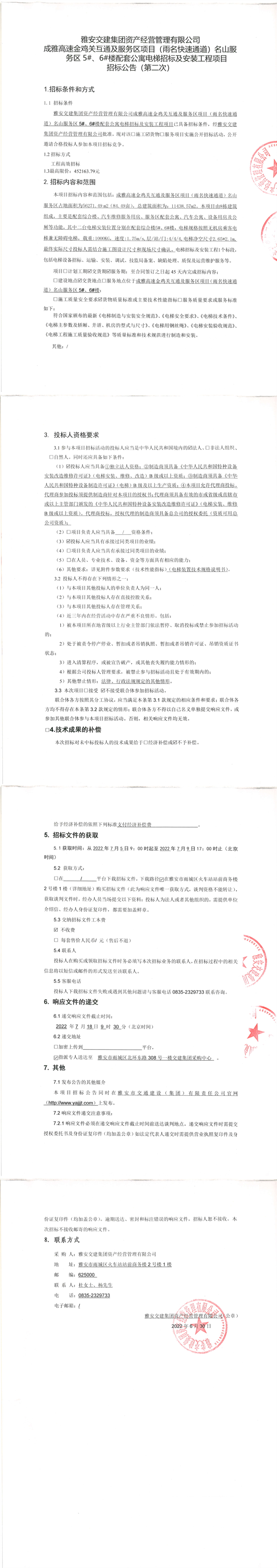 雅安交建集團資產(chǎn)經(jīng)營管理有限公司成雅高速金雞關(guān)互通及服務(wù)區(qū)項目(雨名快速通道)名山服務(wù)區(qū)5#、6#樓配套公寓電梯招標(biāo)及安裝工程項目招標(biāo)公告(第二次)