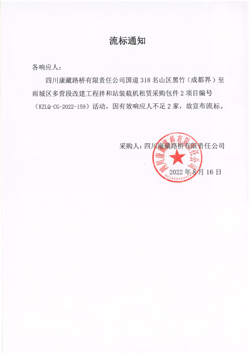 四川康藏路橋有限責(zé)任公司國道318名山區(qū)黑竹(成都界)至雨城區(qū)多營段改建工程拌和站裝載機租賃采購包件2項目流標(biāo)通知