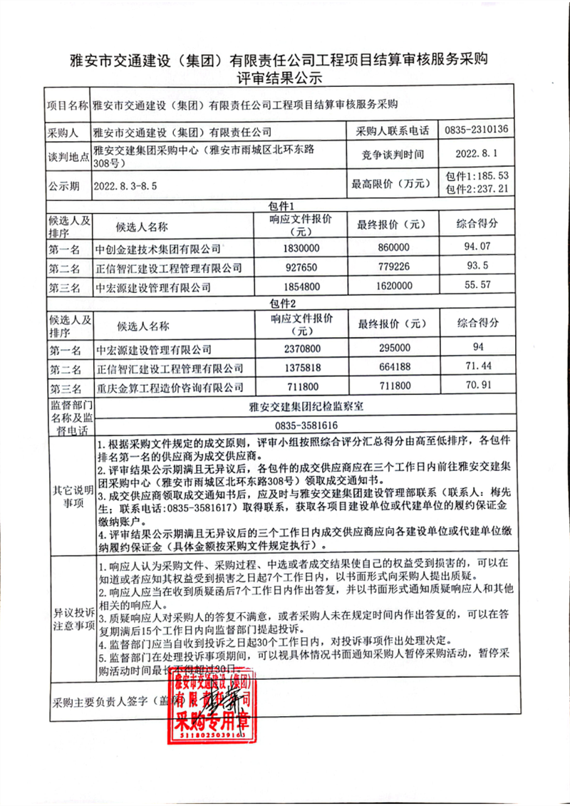 雅安市交通建設(shè)(集團)有限責(zé)任公司工程項目結(jié)算審核服務(wù)采購評審結(jié)果公示