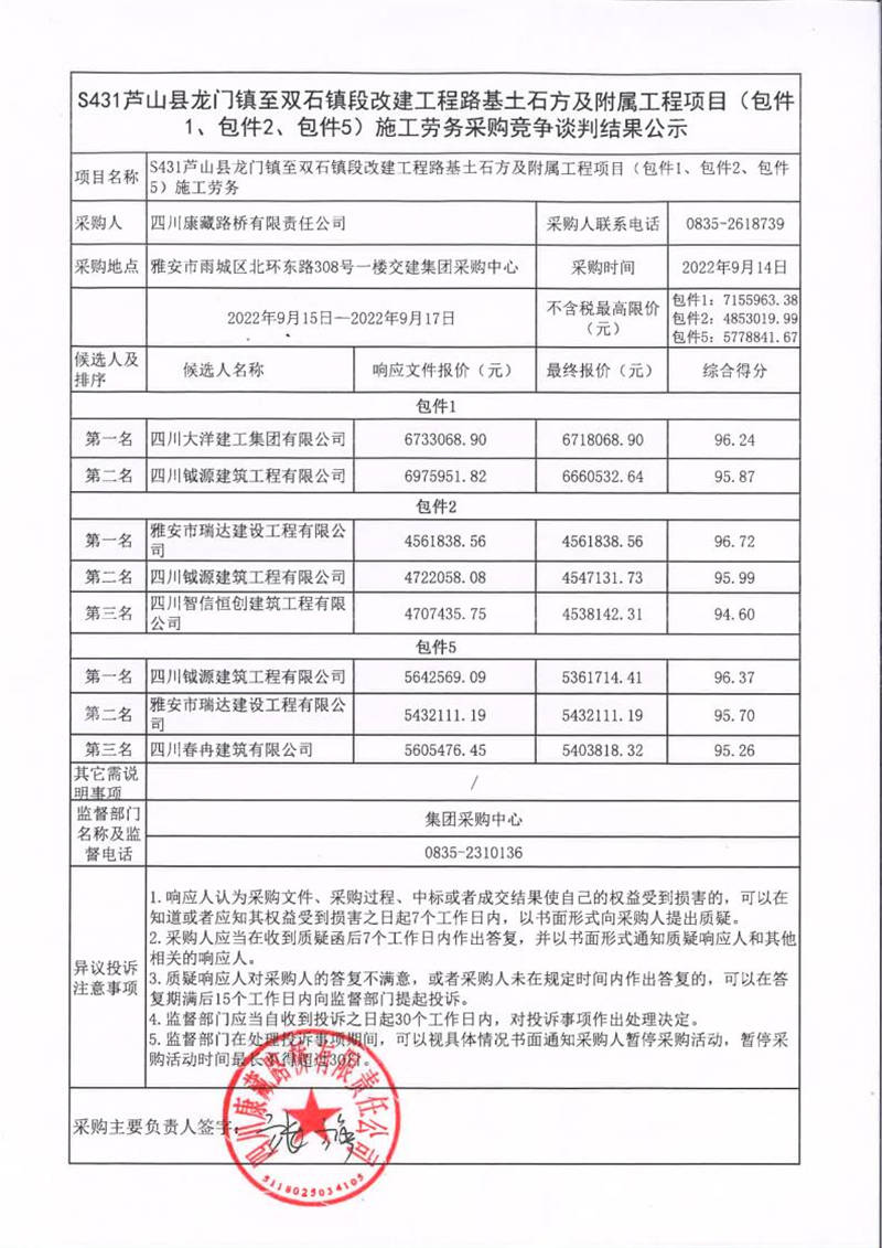 四川康藏路橋有限責(zé)任公司S431蘆山縣龍門鎮(zhèn)至雙石鎮(zhèn)段改建工程路基土石方及附屬工程項(xiàng)目(包件1、包件2、包件5)施工勞務(wù)采購(gòu)競(jìng)爭(zhēng)談判結(jié)果公示