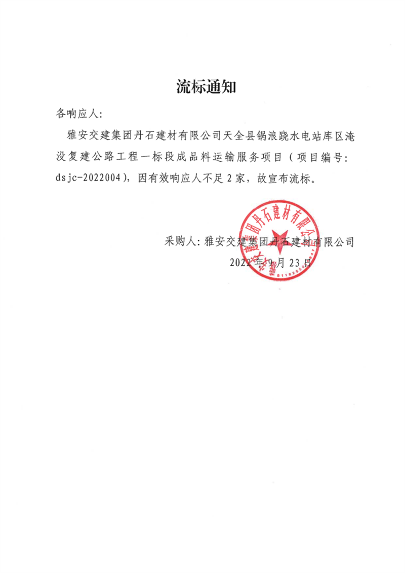 雅安交建集團丹石建材有限公司天全縣鍋浪蹺水電站庫區(qū)淹沒復(fù)建公路工程一標段成品料運輸服務(wù)項目流標通知