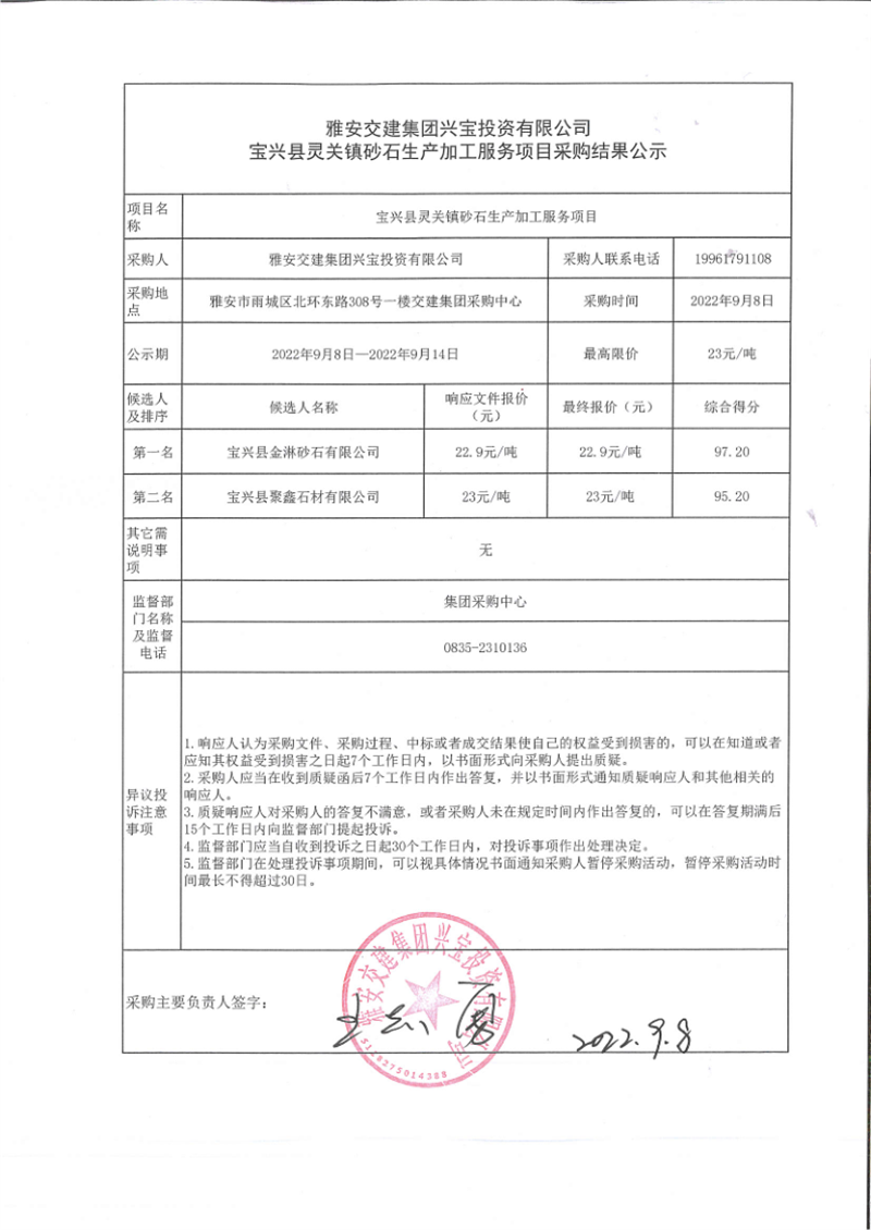 雅安交建集團興寶投資有限公司寶興縣靈關鎮(zhèn)砂石生產加工服務項目采購結果公示