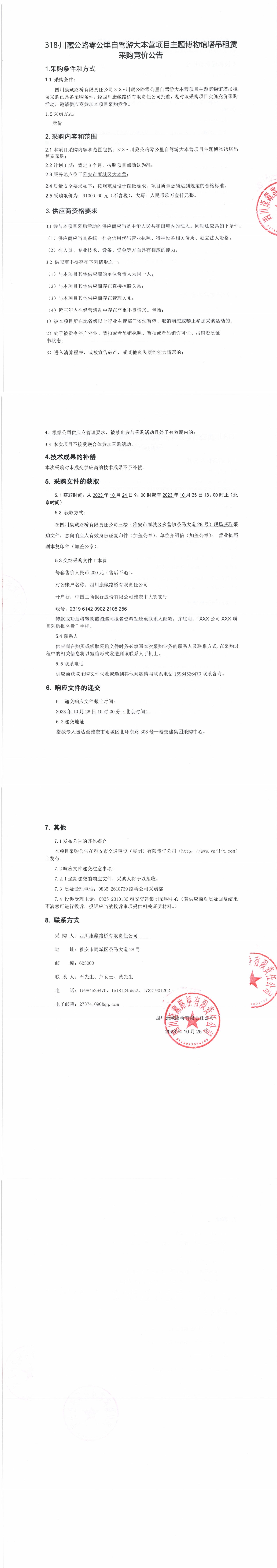 四川康藏路橋有限責(zé)任公司318·川藏公路零公里自駕游大本營項目主題博物館塔吊租賃采購競價公告