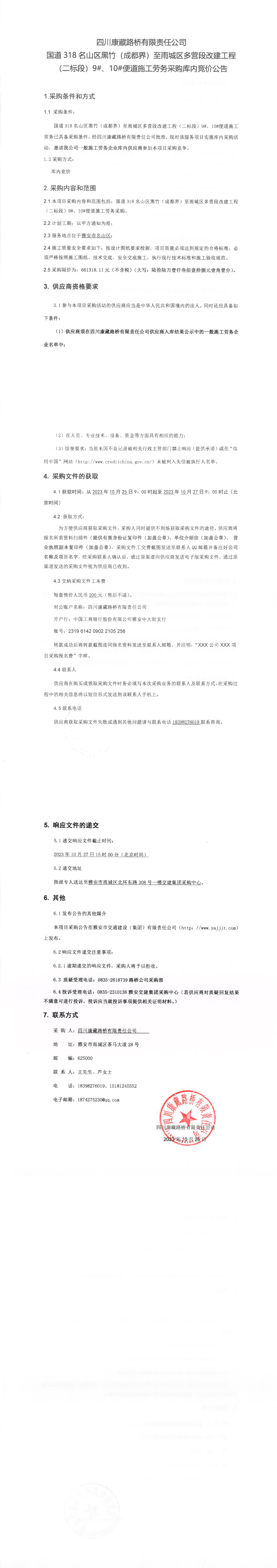 四川康藏路橋有限責任公司國道318名山區(qū)黑竹(成都界)至雨城區(qū)多營段改建工程(二標段)9#、10#便道施工勞務采購庫內競價公告