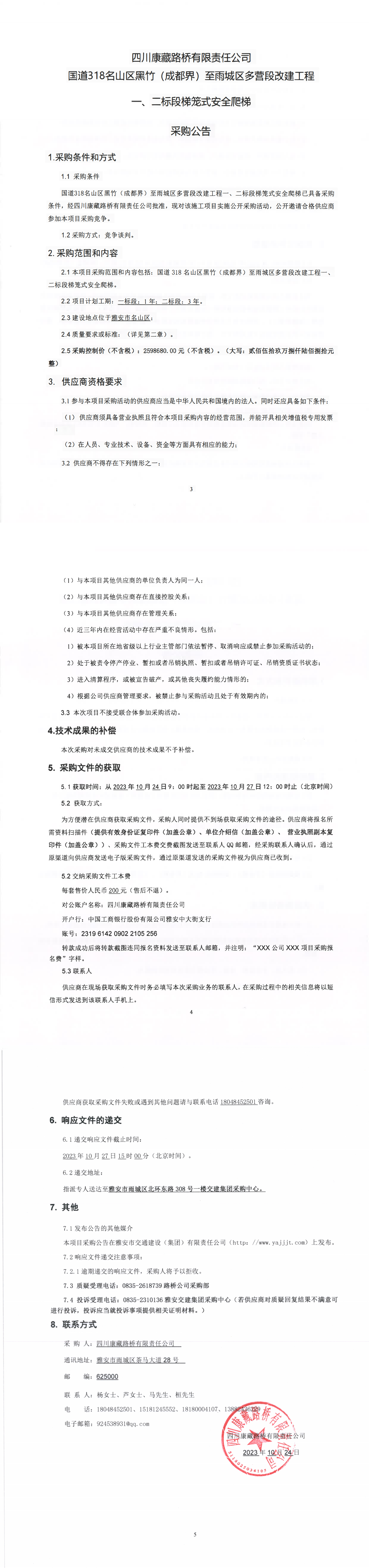 四川康藏路橋有限責任公司國道318名山區(qū)黑竹(成都界)至雨城區(qū)多營段改建工程一、二標段梯籠式安全爬梯采購公告