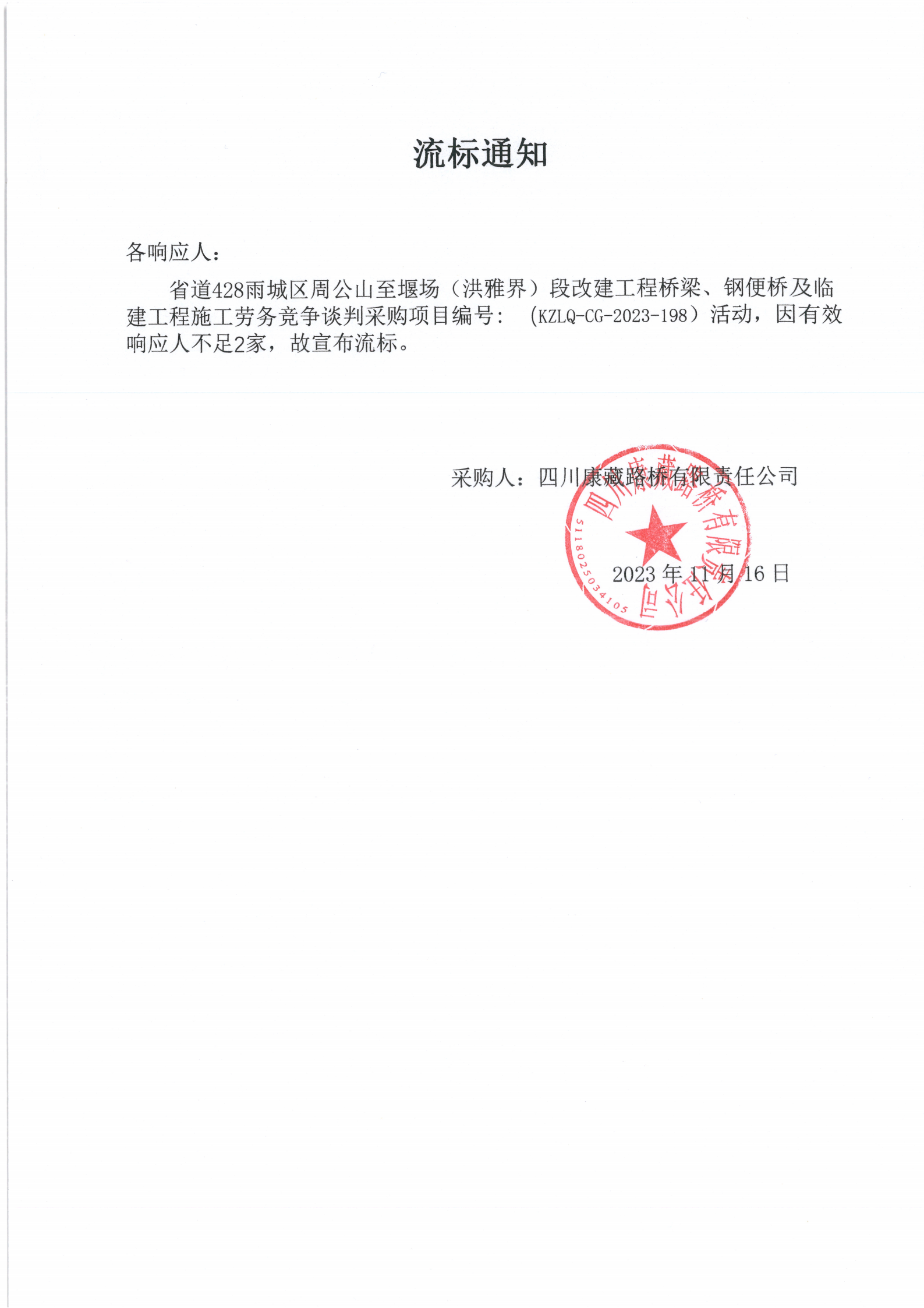 四川康藏路橋有限責任公司省道428雨城區(qū)周公山至堰場(洪雅界)段改建工程橋梁、鋼便橋及臨建工程施工勞務(wù)采購流標通知