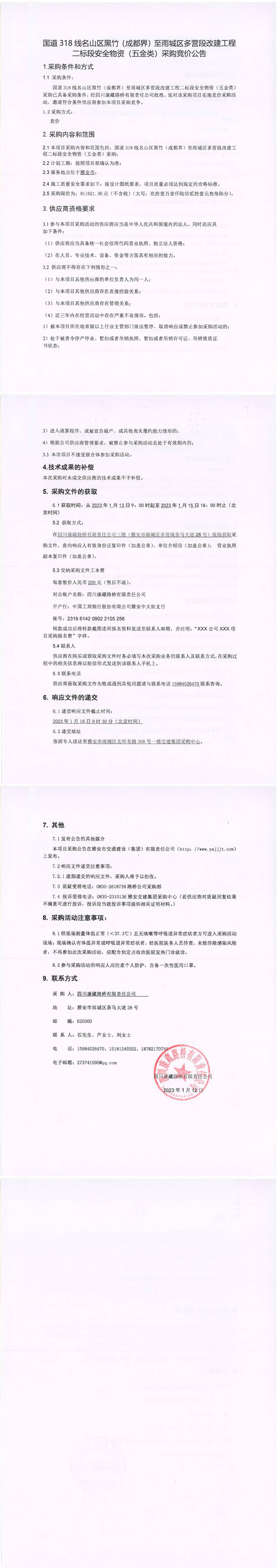 四川康藏路橋有限責(zé)任公司國道318線名山區(qū)黑竹(成都界)至雨城區(qū)多營段改建工程二標(biāo)段安全物資(五金類)采購競價(jià)公告