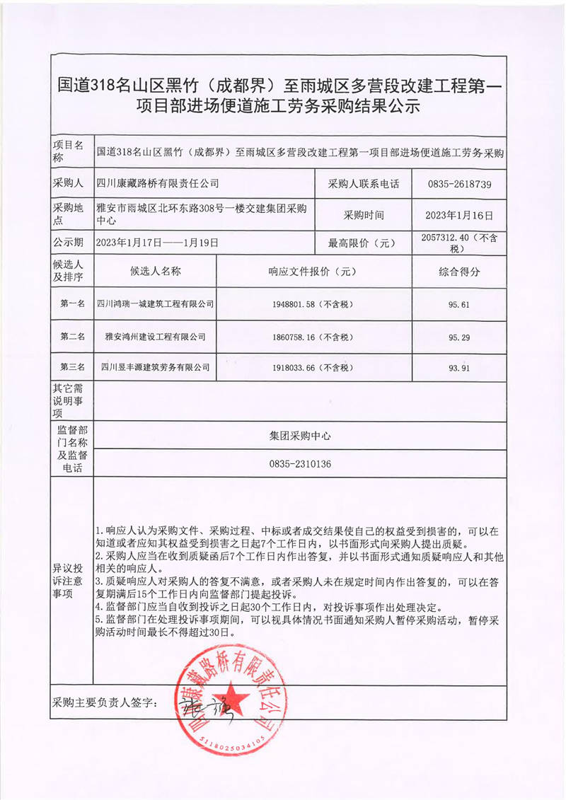 四川康藏路橋有限責(zé)任公司國(guó)道318名山區(qū)黑竹(成都界)至雨城區(qū)多營(yíng)段改建工程第一項(xiàng)目部進(jìn)場(chǎng)便道施工勞務(wù)采購結(jié)果公示