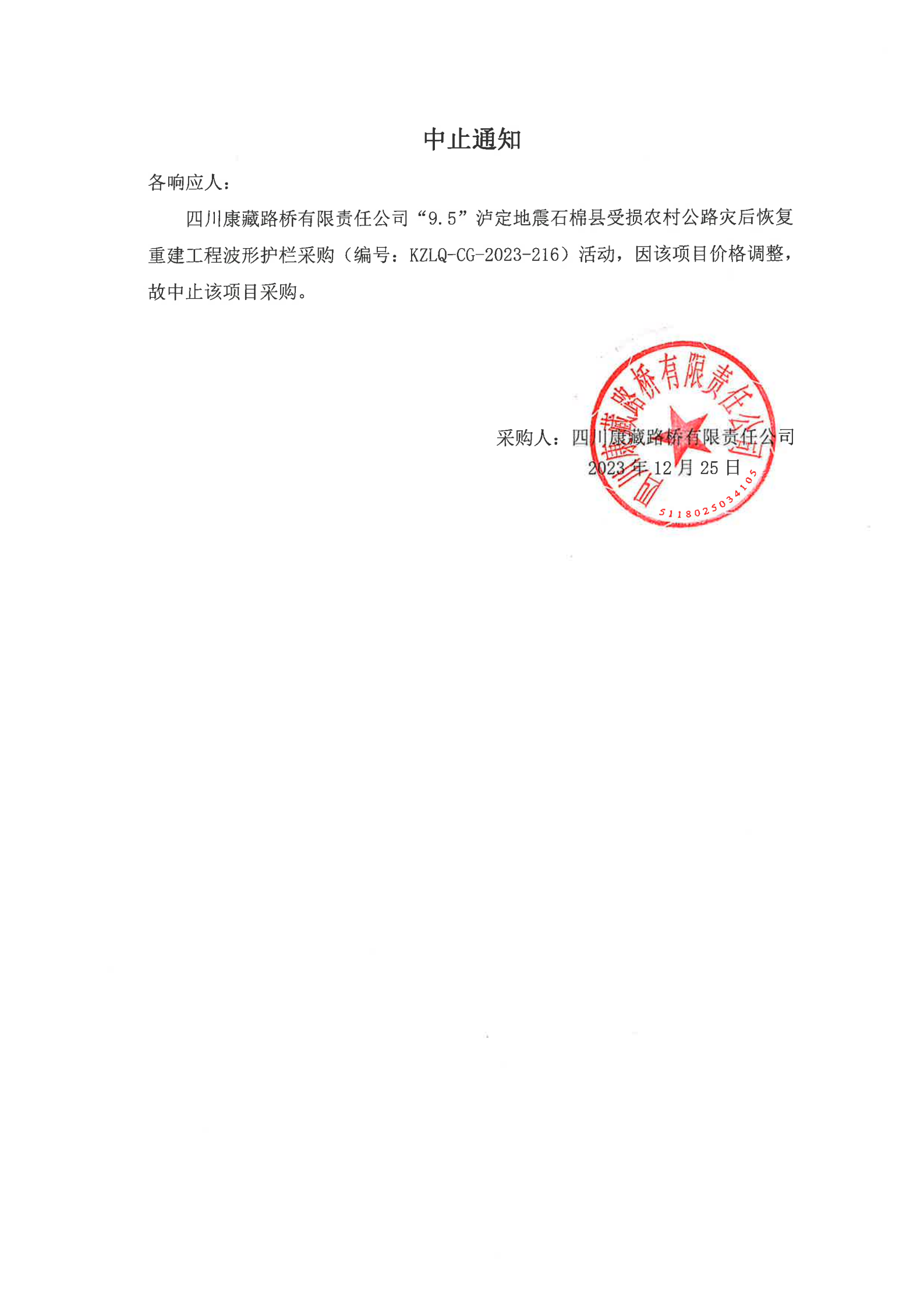 四川康藏路橋有限責任公司“9.5”瀘定地震石棉縣受損農(nóng)村公路災后恢復重建工程波形護欄采購中止通知