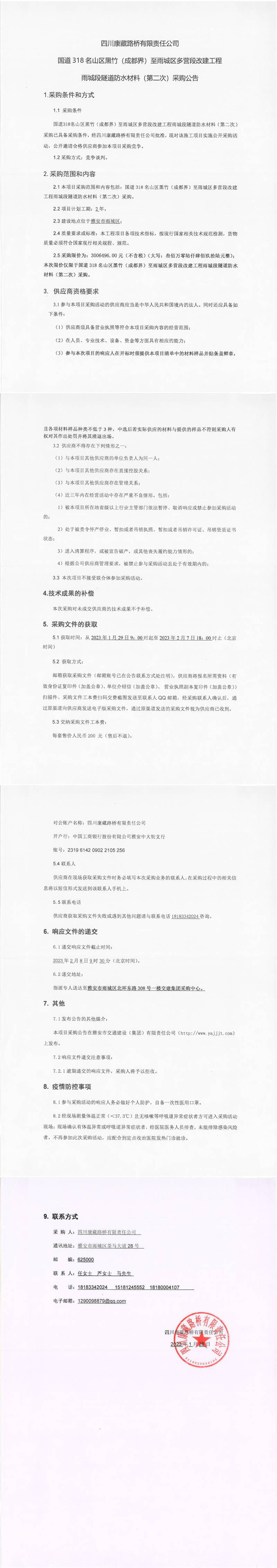 四川康藏路橋有限責(zé)任公司國道318名山區(qū)黑竹(成都界)至雨城區(qū)多營段改建工程雨城段隧道防水材料(第二次)采購公告