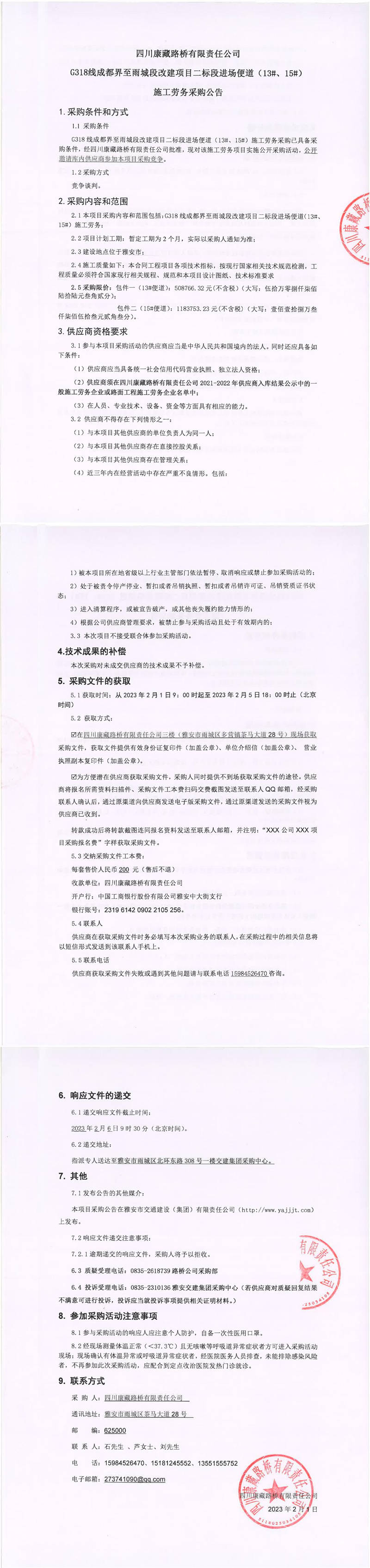 四川康藏路橋有限責(zé)任公司G318線成都界至雨城段改建項(xiàng)目二標(biāo)段進(jìn)場便道(13#、15#)施工勞務(wù)采購公告
